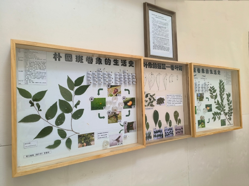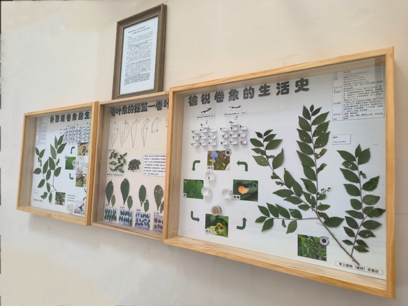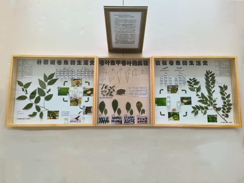 本作品为线下实物标本与线上网络视频相结合制作而成的科普作品。本作品展示了两种卷叶象甲的生活史及寄生性天敌昆虫(寄生蜂,姬蜂科),并通过雌虫卷叶过程的绘图及展开的各虫态的卷叶筒的压制标本展示,揭示雌虫卷叶奥秘。在标本采集、制作过程中,小组成员将两种卷叶象甲生活史各虫态,以及其寄生性天敌昆虫、寄主植物被害状制作成短视频,利用EMC易倍平台官网动态地展示。观者扫描作品中的二维码,即可获得两种卷叶象甲相关内容的动态视频,直观感受到昆虫的神奇,科普性和互动性更强。