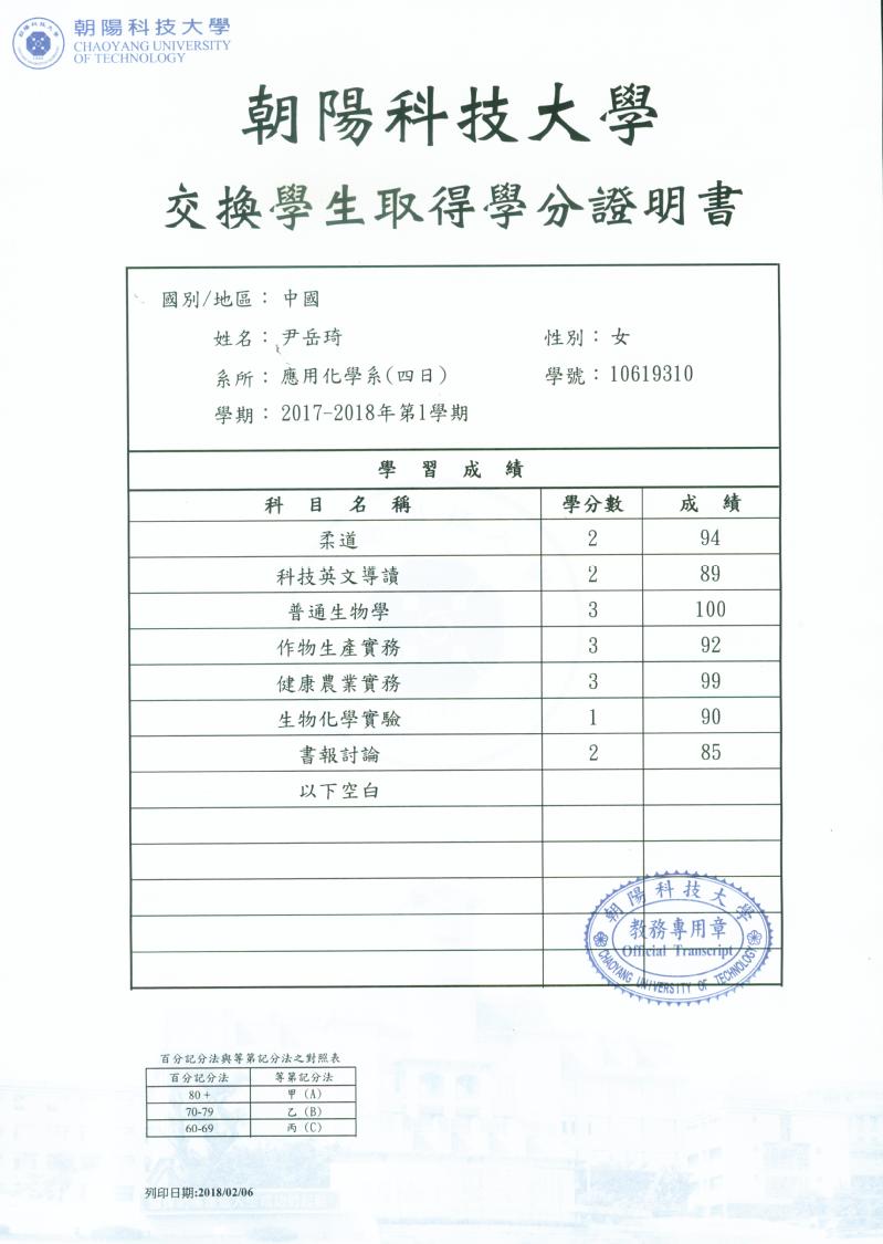 尹岳琦—台湾朝阳科技大学交流成绩单