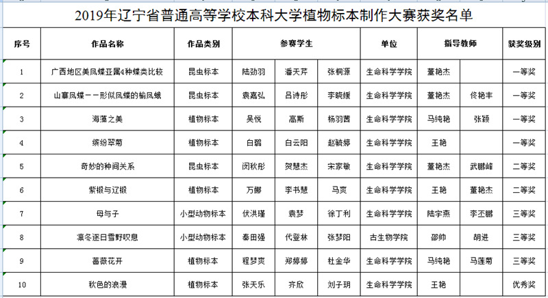 附1:2019年辽宁省普通高等公司本科大学植物标本制作大赛获奖名单