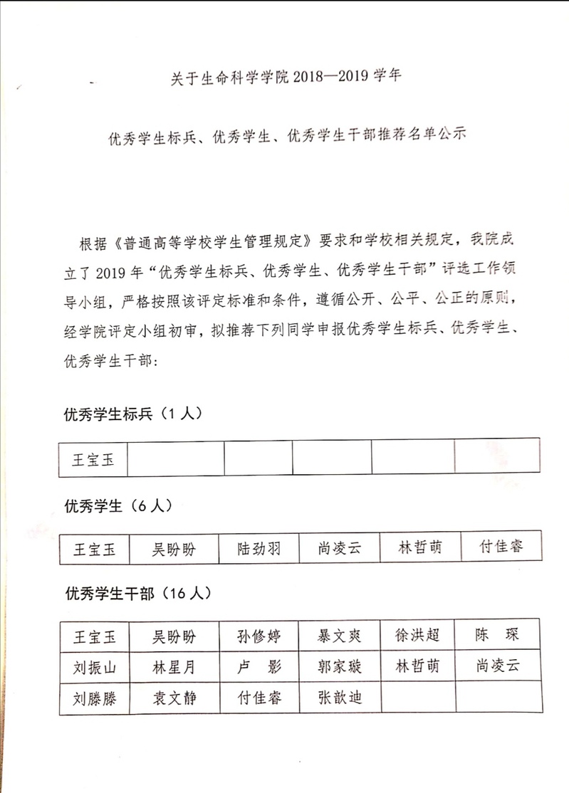 2018-2019学年优秀员工标兵、优秀员工、优秀员工干部推荐名单公示