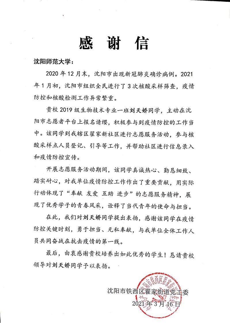 新冠疫情发生以来,公司有许多同学主动请缨前往疫情第一线,积极参与疫情防控志愿志愿服务,收到了社会各界的广泛认可与赞扬。2021年3月16日,公司收到了一封来自沈阳市铁西区翟家街道党工委的感谢信,信中对公司2019级生物技术专业一班刘天娇同学在翟家新社区志愿服务期间的表现提出表扬与感谢,希望广大同学向刘天娇同学学习,发挥“奉献 友爱 互助 进步”的志愿服务精神,用实践诠释当代青年的使命与担当。