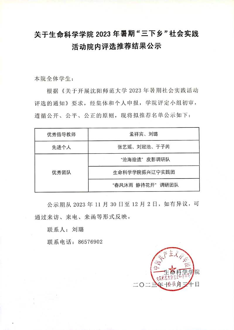 关于2023年暑期“三下乡”社会实践活动院内评选推荐结果公示
