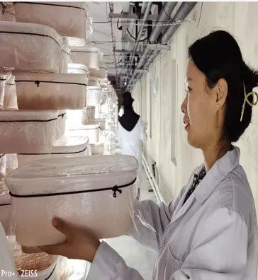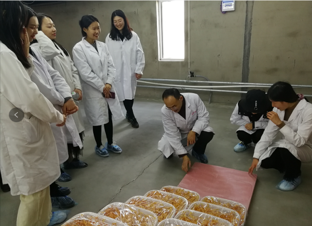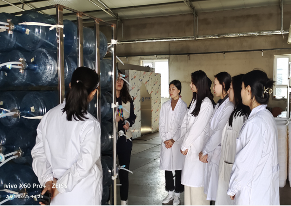蛹虫草是我国名贵的食药用真菌,具有抗肿瘤、抗真菌、消炎、抗疲劳、延缓衰老和増强免疫等药理功效。它是冬虫夏草的最佳替代品,目前从技术层面还有很多难题如菌种退化、病原菌防治等问题没有解决。因此本次实地参观学习可以帮助同学们更好地了解整个蛹虫草的生产流程和关键环节。同学们在公司总经理陈其周老师的带领下,从菌种繁育开始逐一观摩生产的每道工序,学习工厂化栽培技术。在种源分装环节,企业将发酵后的液体菌种分装到特制的无菌桶中,并保持分装过程在无菌环境中操作。每个桶上都有对应的二维码可以追踪生产进度和出入库情况,也方便查询出售后是否回收。细节决定成败!企业在接种环节基本实现自动化,且在运输途中有效实现了减少震动防止空气进入造成污染。在发菌管理期,初期培养时处于避光条件下,进入生殖生长期时见光,注意调节蛹虫草生长适宜的温度、湿度及CO₂浓度。同时,栽培车间温度、湿度、光照、氧气各个参数均要达到优化配置。