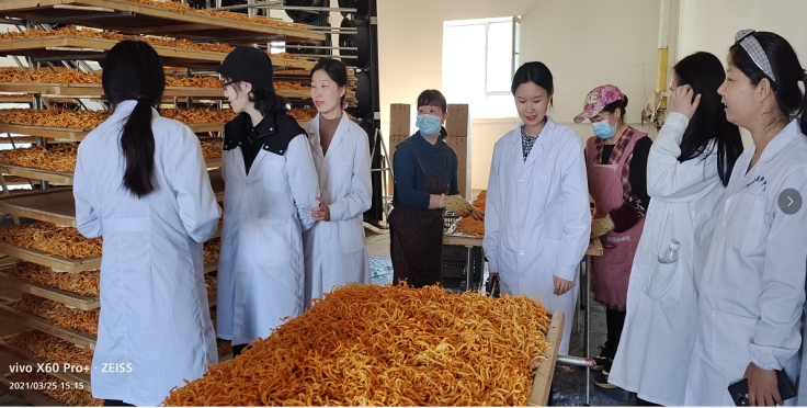 2021年3月25日下午,王升厚老师与徐方旭老师带领微生物学硕士点微生物制药方向6位研究生一年级同学赴辽宁省蛹虫草菌种繁育企业沈阳绿之谷现代农业有限公司系统参观了蛹虫草从育种-栽培-采收加工的全部流程。